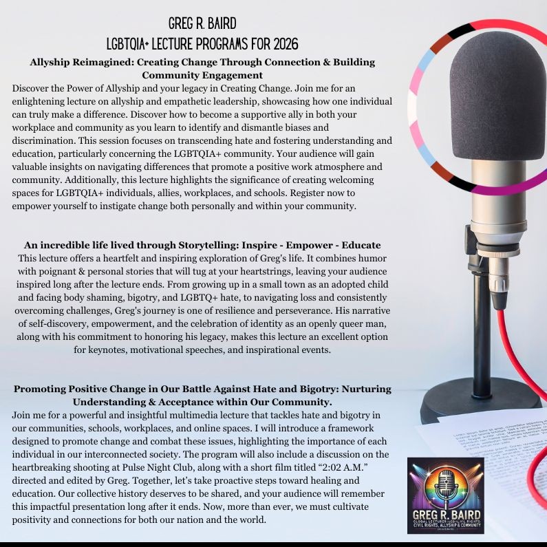 Greg R. Baird is a dynamic lecturer, educator, content creator, and passionate advocate for LGBTQIA+ civil rights and allyship. With a signature mix of heart, humor, and inspiration, his speeches captivate and empower audiences. Book Greg for your next event and get ready for an engaging, educational, and unforgettable experience!