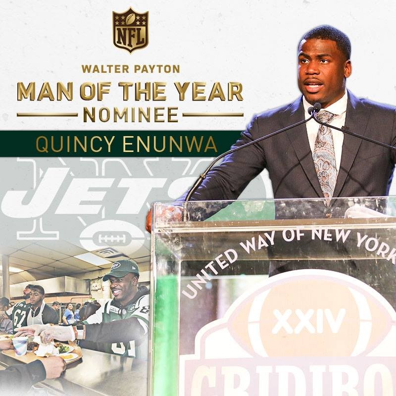 The 2017 Walter Payton Man of the Year Award nominee, Quincy Enunwa is a former NFL wide receiver. He was drafted by the New York Jets in the sixth round of the 2014 NFL Draft out of Nebraska where he was named to the Scholar-Athlete Honor Roll and was selected as Nebraska's Offensive MVP his senior year. In his 2013 season at Nebraska, Enunwa broke Heisman Trophy winner Johnny Rodgers's school record for most touchdown receptions in a season, catching 12 touchdowns in his senior year. Quincy had a breakout season in 2016 with the Jets coming second in receptions, yards, and touchdown receptions on the team.